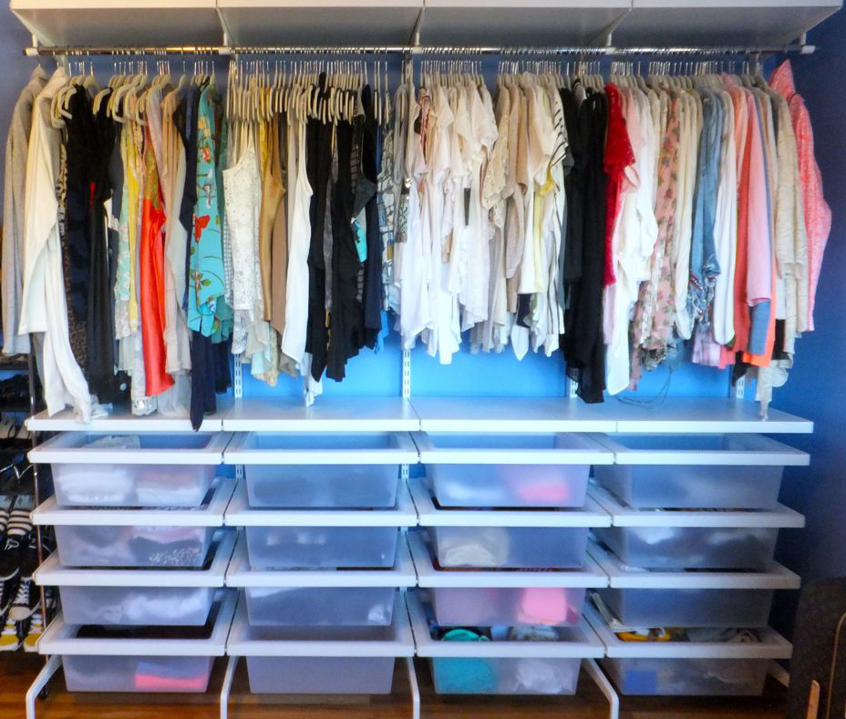 - Hang as many clothes that comfortably fit into the closet. This includes tank tops, workout tops, and lingerie if there’s room and enough hangers. Hanging keeps things neat, wrinkly free, in sight, and easy to access. Arrange clothes like with like and in order: tanks (toward the front), sleeveless, short-sleeve, long-sleeve, sweaters, jackets (toward the back,) etc.