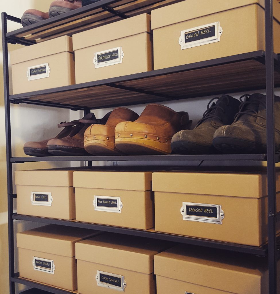 - If you need to maximize space, place one shoe forward and the other in the opposite direction, heel showing. This magically creates space both on shelves and in hanging shoe nooks. Try it!